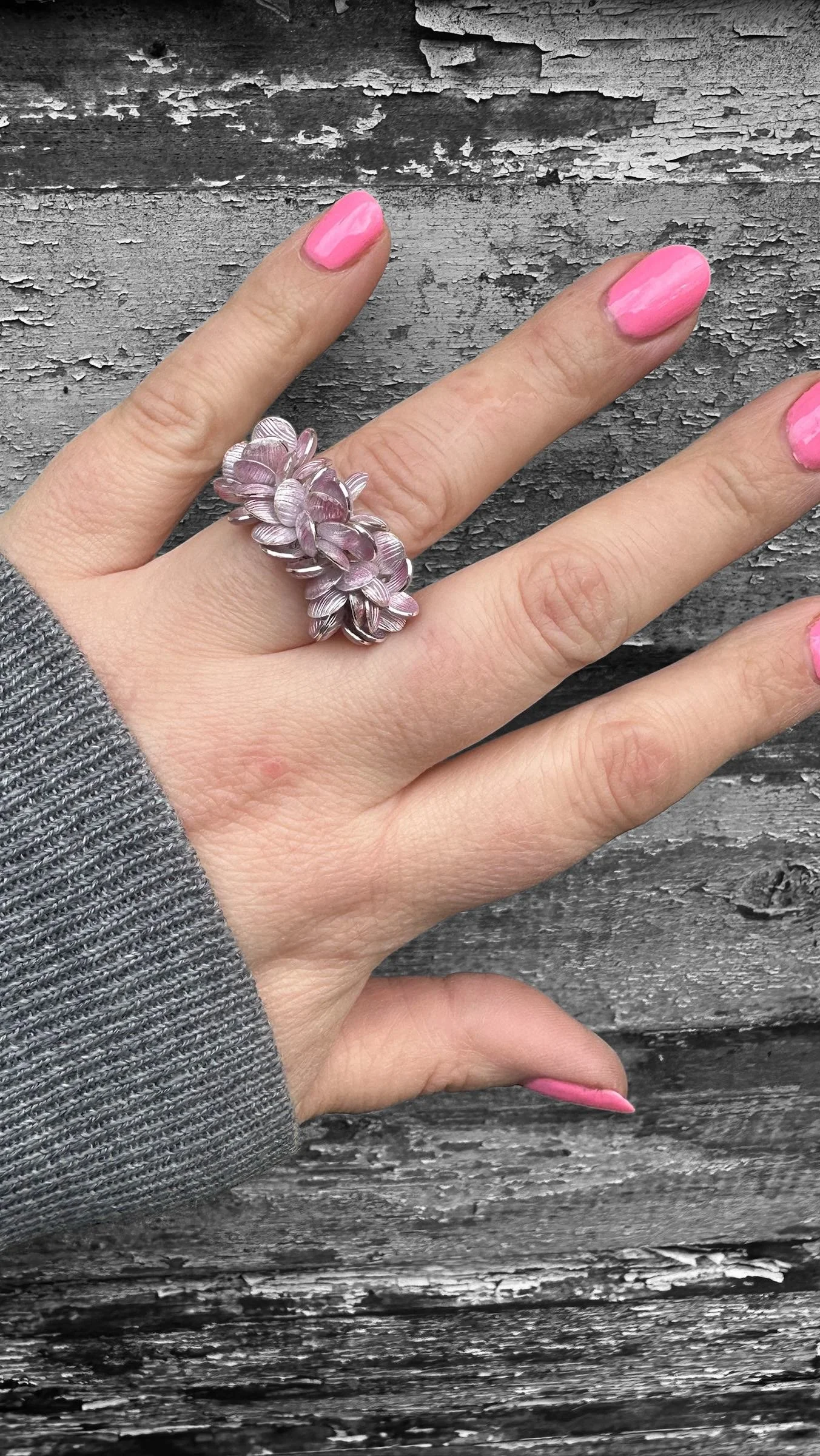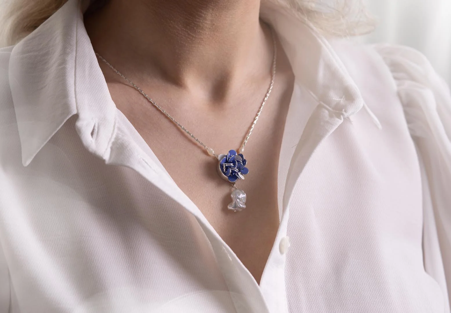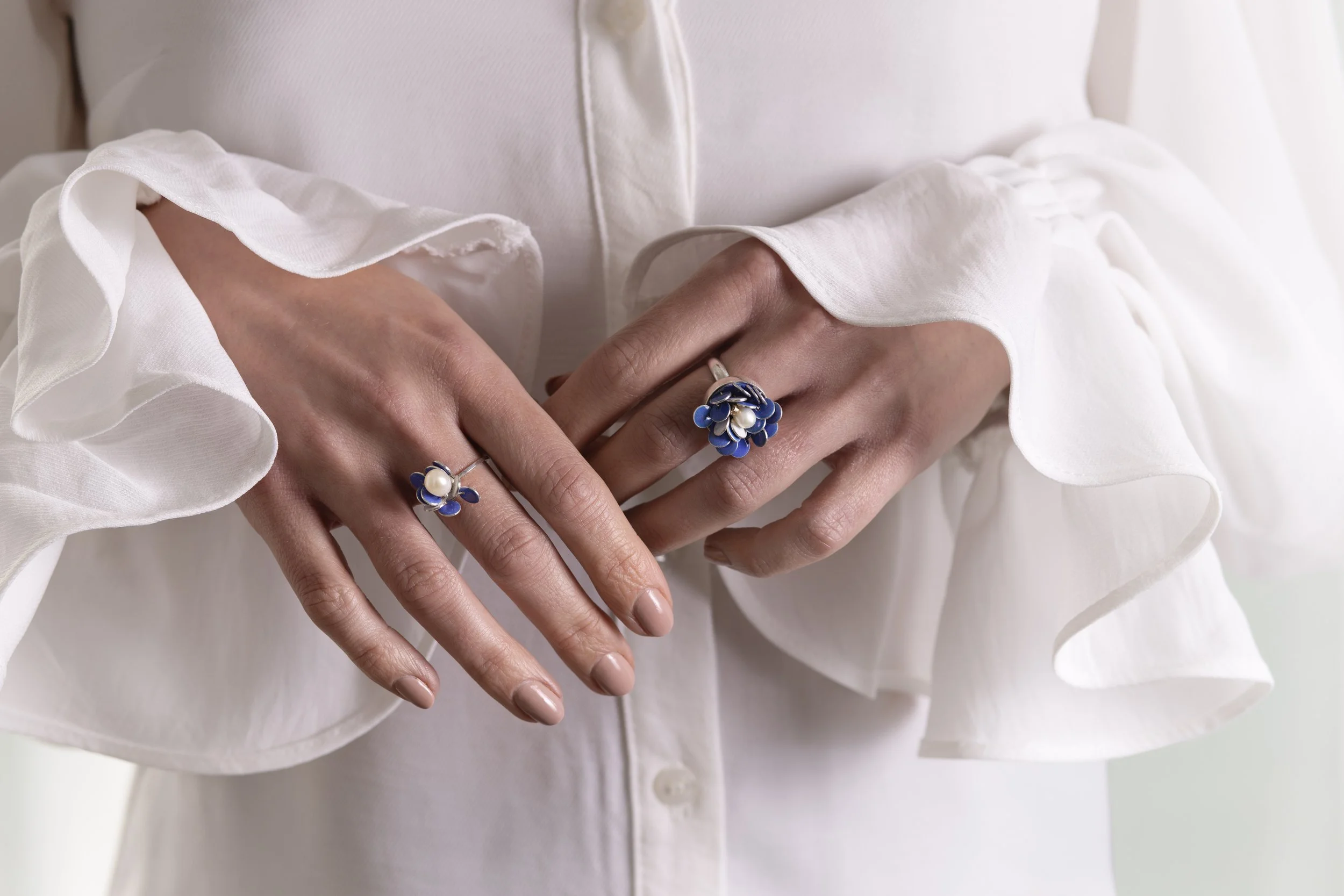 The inspiration for Charlotte’s intricate enamelled jewellery was initially sparked by the sequins on her daughter’s T-shirt, which caught her eye in an otherwise mundane moment when doing laundry. In replicating the tiny moving parts in silver and enamel, Charlotte has created a jewellery collection which is feminine, tactile and reminiscent of the heavily petalled dahlias in her garden. Each silver petal has been enamelled on both sides in a soft blue or white enamel and sewn into place to allow a subtle playful movement when touched. The edges of each petal have been painstakingly polished so the silver will catch the light, while embellishments of cultured freshwater pearls and recycled 9ct gold add lustre, texture and visual interest to each piece.